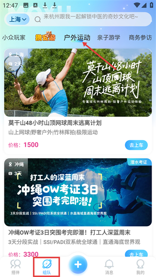 3、組隊板塊戶外運動類,有莫干山網(wǎng)球、沖繩潛水考證行程,提供專屬戶外體驗與極限樂趣,可點擊去上車。