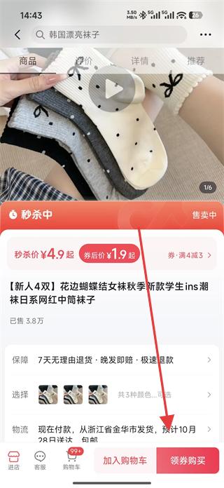 2、領(lǐng)取后瀏覽商城商品如新人4雙花邊蝴蝶結(jié)女襪,點(diǎn)擊進(jìn)入商品詳情頁面。
