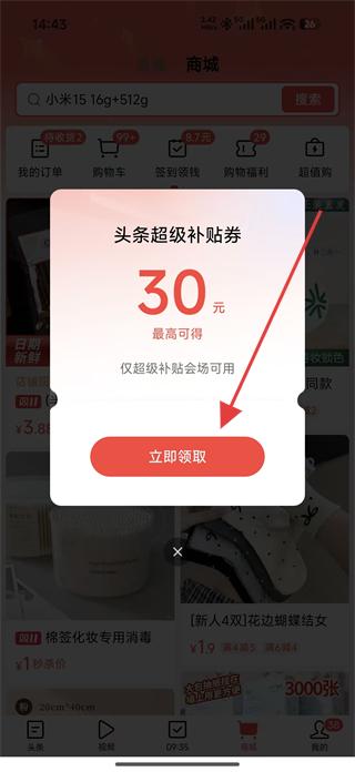 1、進(jìn)入商城頁面看到頭條超級(jí)補(bǔ)貼券的提示,點(diǎn)擊立即領(lǐng)取按鈕,獲取30元補(bǔ)貼券。