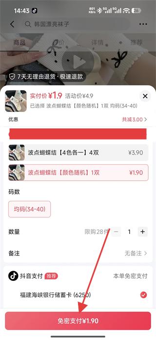 4、在訂單確認(rèn)頁面選擇商品款式、碼數(shù)和數(shù)量,確認(rèn)支付方式后,點(diǎn)擊免費(fèi)支付按鈕,完成商品購買,后續(xù)可查看訂單物流,等待商品送達(dá)。