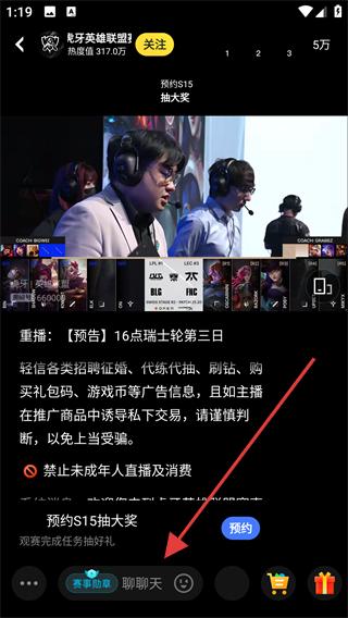 2、在全球總決賽頁面找到虎牙英雄聯(lián)盟賽事直播,點擊進(jìn)入直播間,能看到直播畫面,還有觀眾互動區(qū)域,頁面下方有聊聊天等互動按鈕。