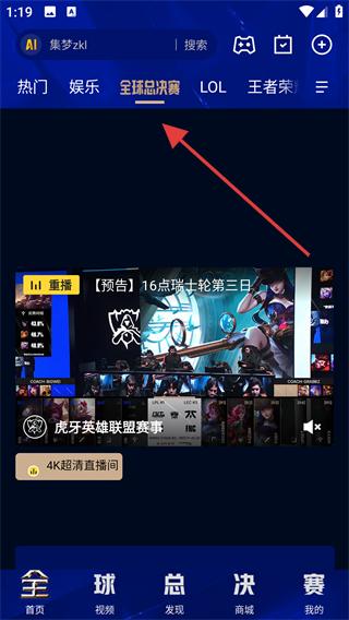1、可看到搜索欄,還有熱門、娛樂、全球總決賽等分類標(biāo)簽,點擊全球總決賽標(biāo)簽,進(jìn)入相關(guān)賽事頁面。