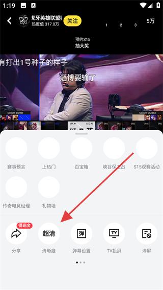 3、點擊直播間的設(shè)置相關(guān)按鈕,彈出包含賽事預(yù)告、清晰度等功能的選項欄,選擇清晰度選項,進(jìn)入清晰度設(shè)置界面。