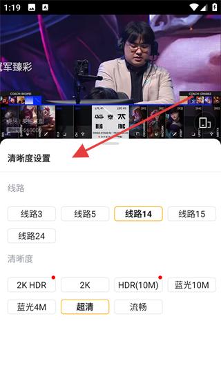4、在清晰度設(shè)置界面,可看到線路和清晰度的不同選項,根據(jù)網(wǎng)絡(luò)情況和觀看需求,選擇合適的線路,比如線路14,再選擇合適的清晰度。