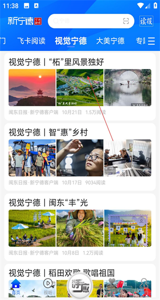 1、打開(kāi)新寧德軟件,進(jìn)入視覺(jué)寧德板塊,瀏覽柘里風(fēng)景獨(dú)好資訊,欣賞當(dāng)?shù)仫L(fēng)景圖片,開(kāi)啟多板塊資訊瀏覽的第一步,為了解寧德視覺(jué)美景做準(zhǔn)備。