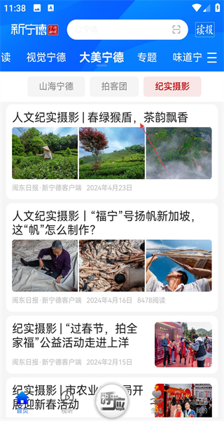 4、切換到大美寧德板塊的紀(jì)實(shí)攝影,瀏覽春綠猴盾茶韻飄香資訊,欣賞茶鄉(xiāng)攝影作品,完成新寧德軟件多板塊視覺(jué)與文化資訊瀏覽的操作流程。