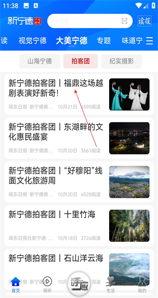 3、切換到大美寧德板塊的拍客團(tuán),瀏覽福鼎越劇表演好新奇資訊,了解當(dāng)?shù)卦絼”硌輧?nèi)容,繼續(xù)完成多板塊資訊瀏覽的步驟,豐富文化活動(dòng)知識(shí)體驗(yàn)。