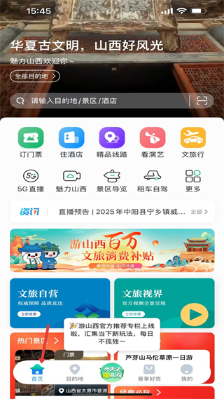 1、首頁有訂門票、住酒店等功能,展示文旅消費補貼活動,還有文旅自營、視界板塊,提供山西旅游資訊與服務(wù)。