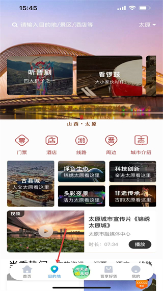 2、目的地頁太原,含門票、酒店等服務(wù),有古縣城、綠色生態(tài)等板塊,還有太原城市宣傳片,呈現(xiàn)當(dāng)?shù)匚穆锰厣?