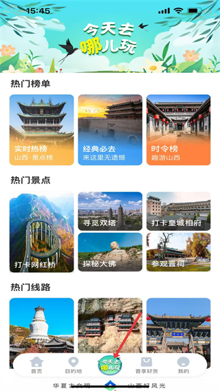 3、今天去哪兒玩頁,有實時熱榜、經(jīng)典必去等榜單,熱門景點有網(wǎng)紅橋、大佛等,熱門線路豐富,助力規(guī)劃山西行程。