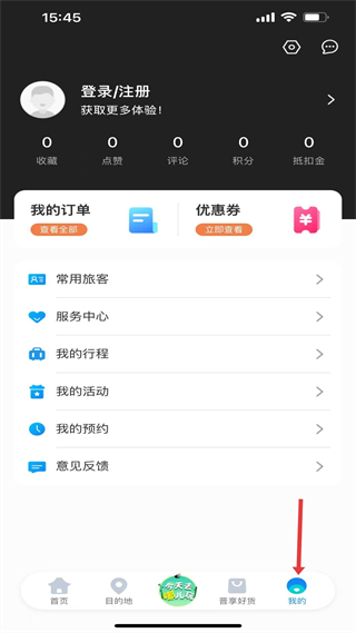 4、我的頁可登錄注冊,有訂單、優(yōu)惠券功能,能管理行程、預(yù)約,查看收藏、積分等個人數(shù)據(jù)。