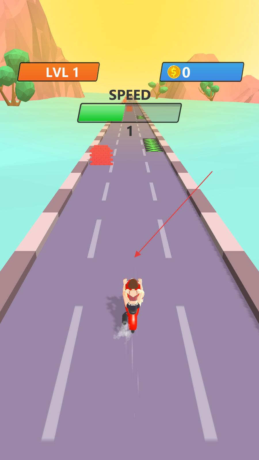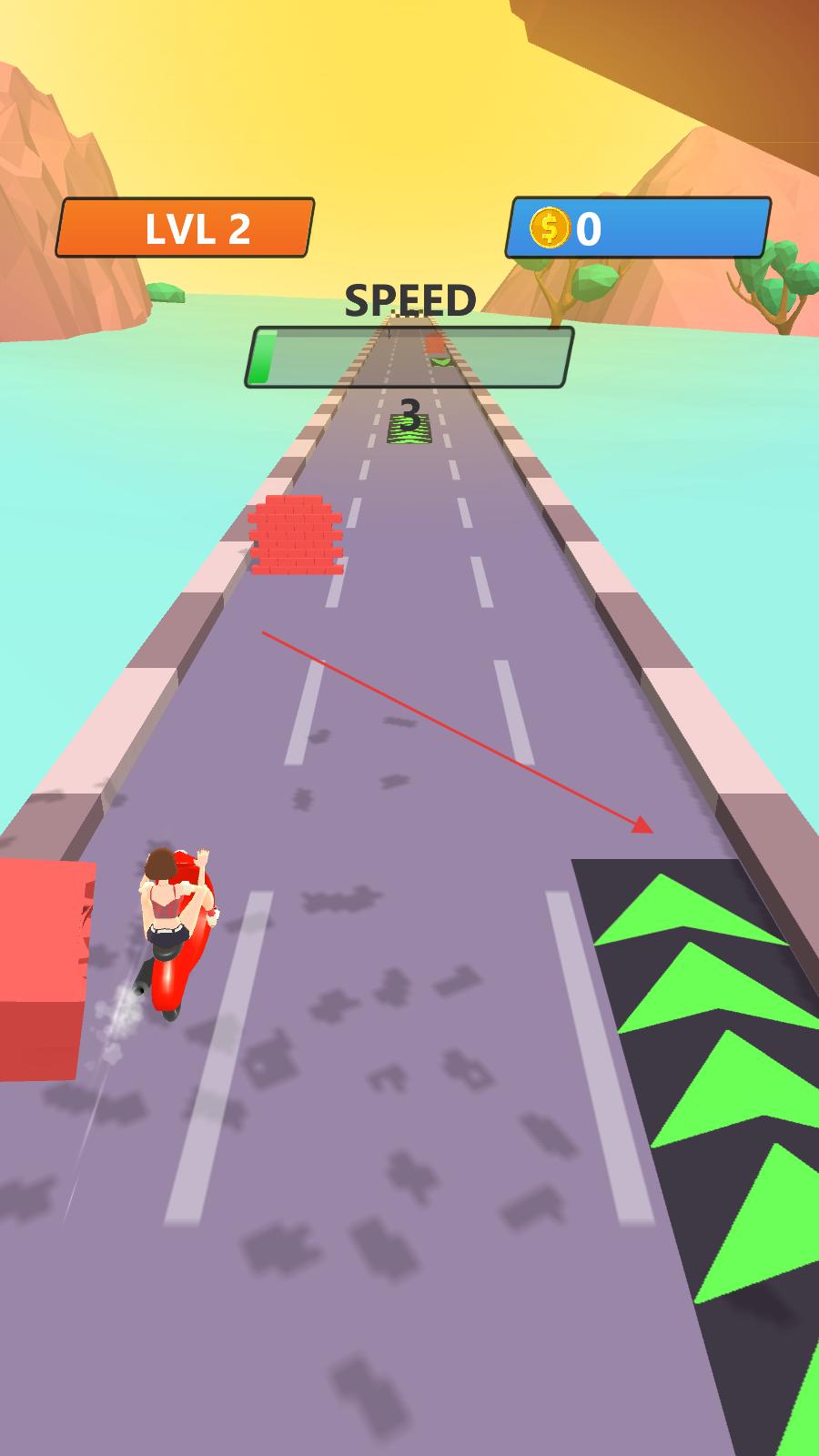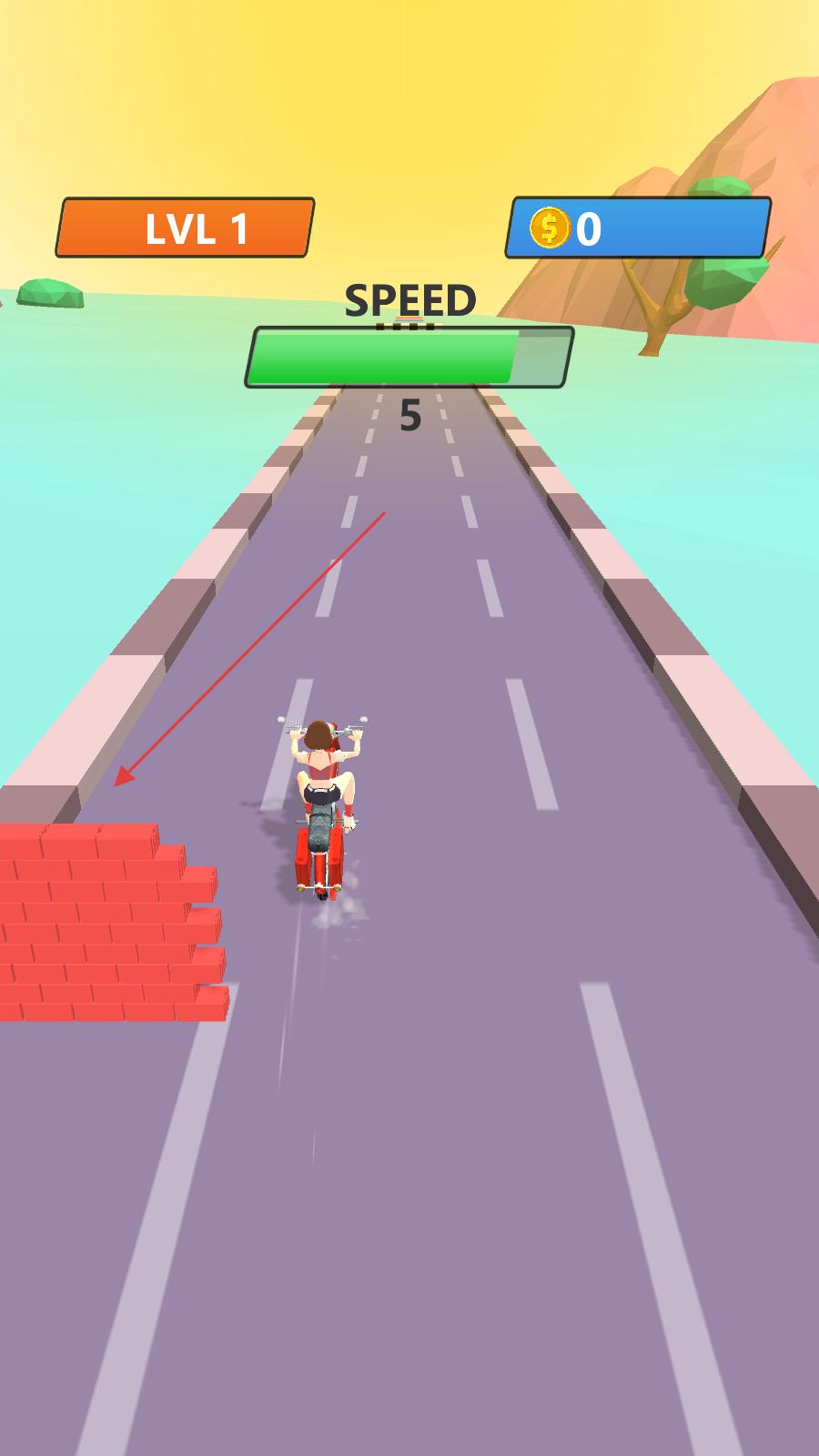 2、在賽道上通過滑動(dòng)屏幕或點(diǎn)擊虛擬按鍵等方式,控制小姐姐駕駛的摩托前進(jìn),并靈活躲避賽道上如紅色磚墻之類的障礙物,保證行駛安全。