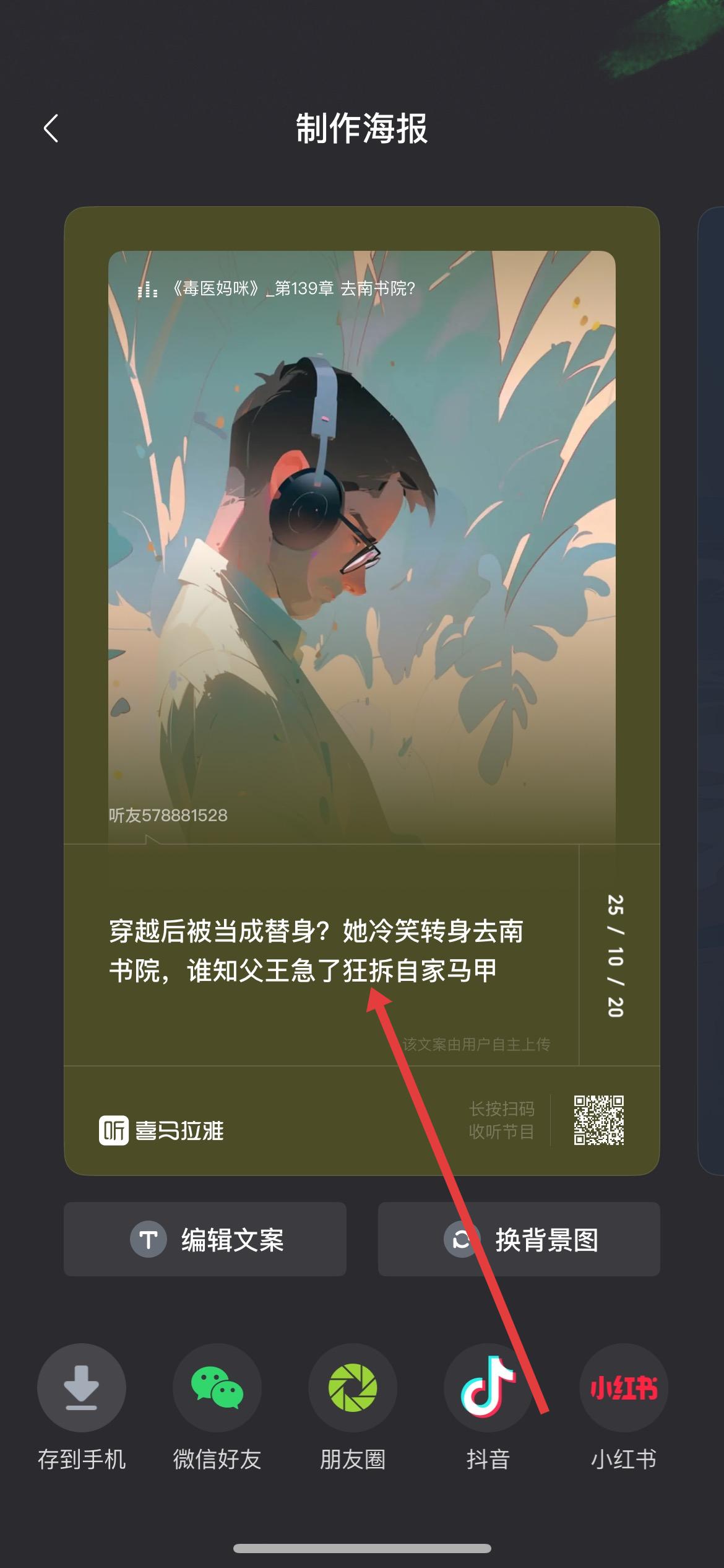 4、進入制作海報頁面,可看到生成的海報,上面有音頻相關(guān)文案,還能編輯文案、換背景圖,也可將海報存到手機或分享到其他平臺。