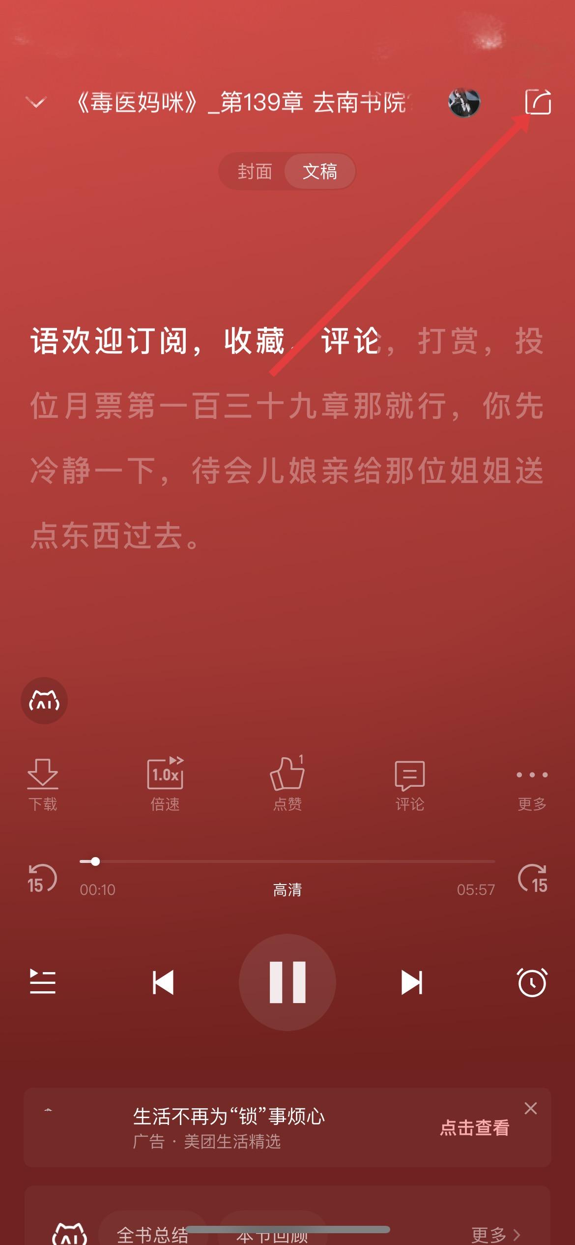 2、音頻播放頁面,可看到音頻的標(biāo)題、文稿等,若想分享該音頻,點擊右上角分享圖標(biāo)。