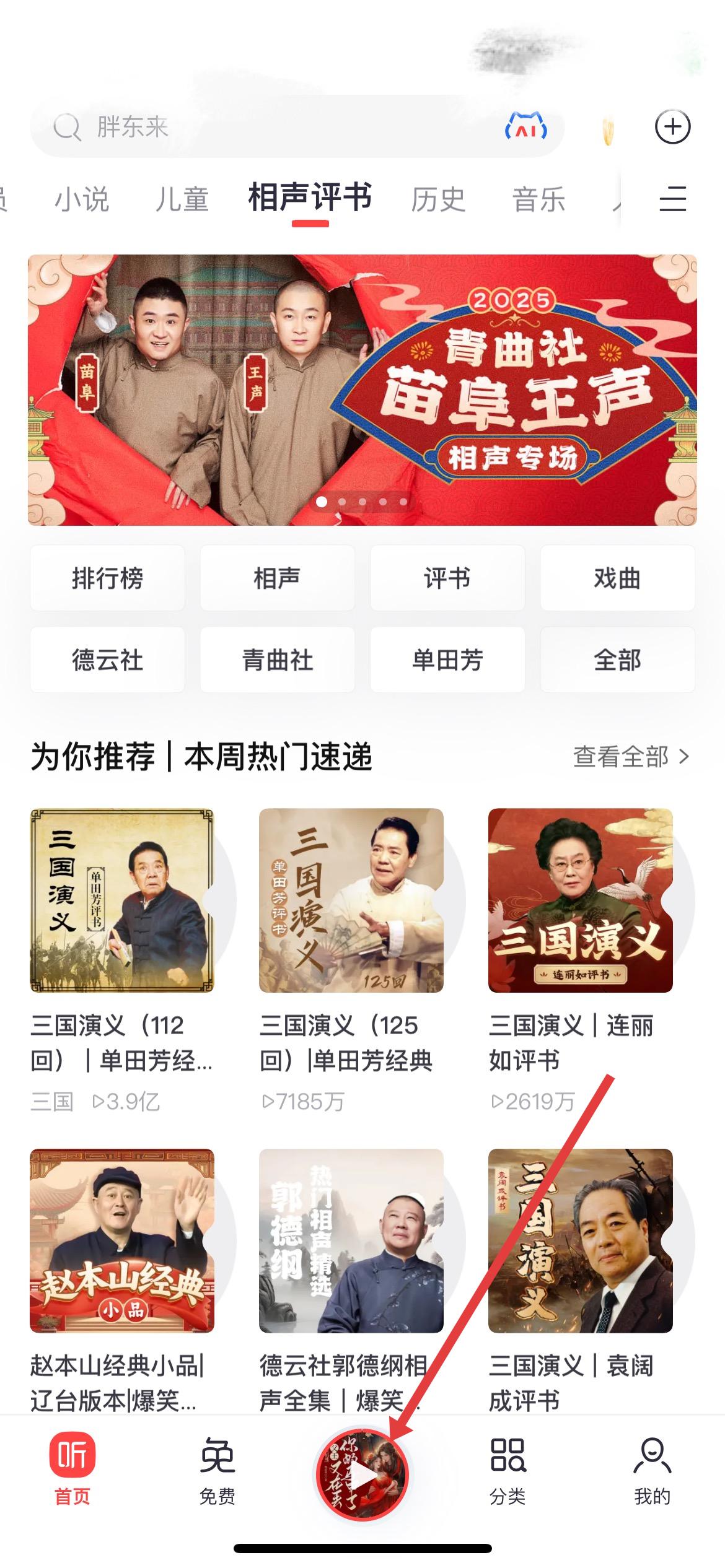 1、進入喜馬拉雅首頁,能看到相聲評書等分類,還有推薦的音頻內(nèi)容,若在聽音頻,點擊底部播放中的音頻,進入播放頁面。