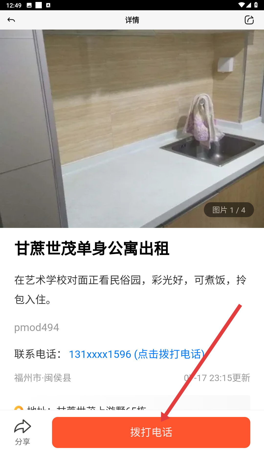 3、房源詳情界面,可查看房源圖片、位置、描述等信息,若有意向可點(diǎn)擊撥打電話按鈕聯(lián)系房東。