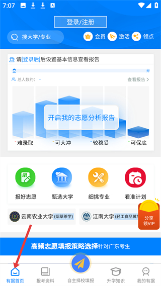 1、有據(jù)首頁可登錄注冊(cè)、搜大學(xué)專業(yè),開啟志愿分析報(bào)告,有報(bào)好志愿、甄選大學(xué)等功能,展示相關(guān)院校信息。