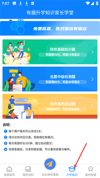 3、升學(xué)知識(shí)板塊,設(shè)有家長(zhǎng)學(xué)堂,包含多類答題板塊,答題可獲有據(jù)點(diǎn),明確標(biāo)注答題規(guī)則。