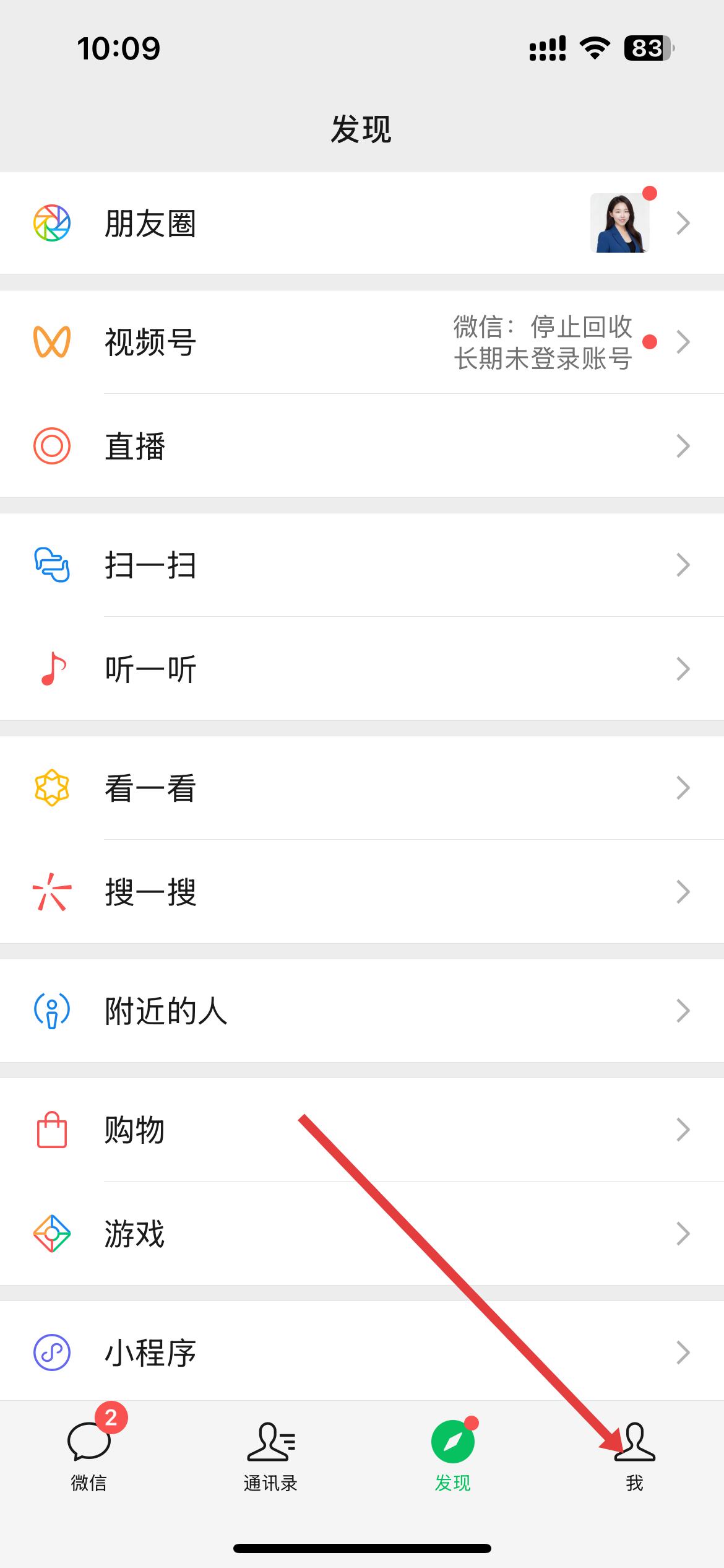 1、打開微信后,進(jìn)入發(fā)現(xiàn)頁面,能看到朋友圈、視頻號(hào)等功能選項(xiàng),點(diǎn)擊右下角的我,進(jìn)入個(gè)人相關(guān)頁面。