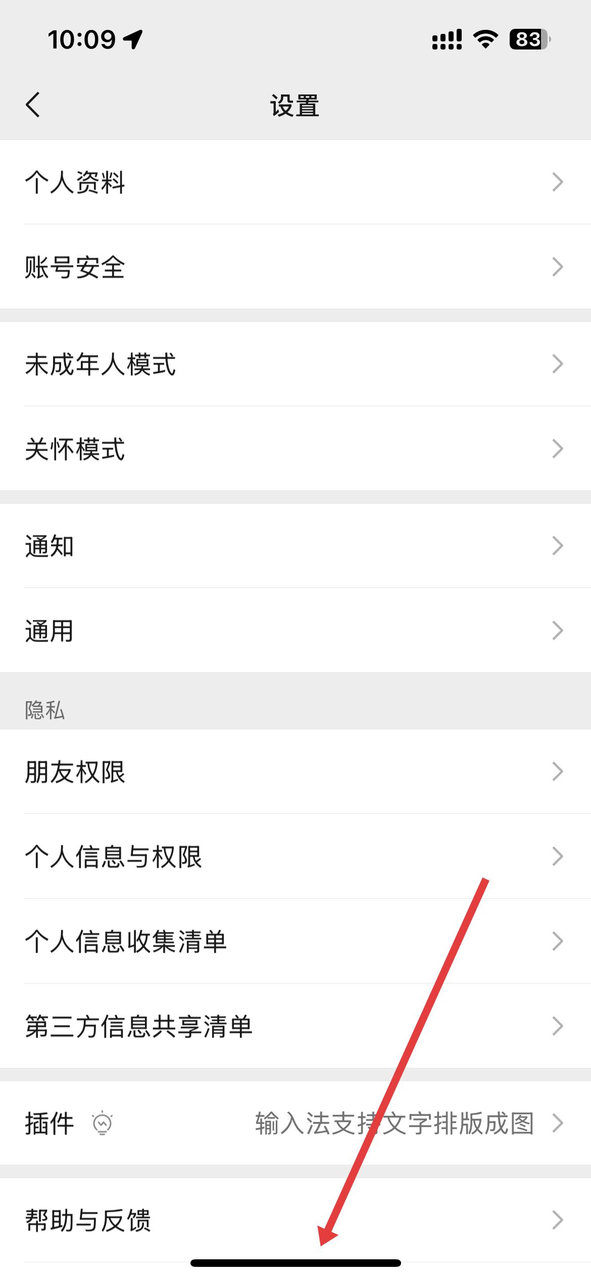 3、進(jìn)入設(shè)置界面后,里面有個(gè)人資料、賬號(hào)安全等眾多設(shè)置項(xiàng),從下往上滑動(dòng)屏幕,查看更多設(shè)置選項(xiàng)。