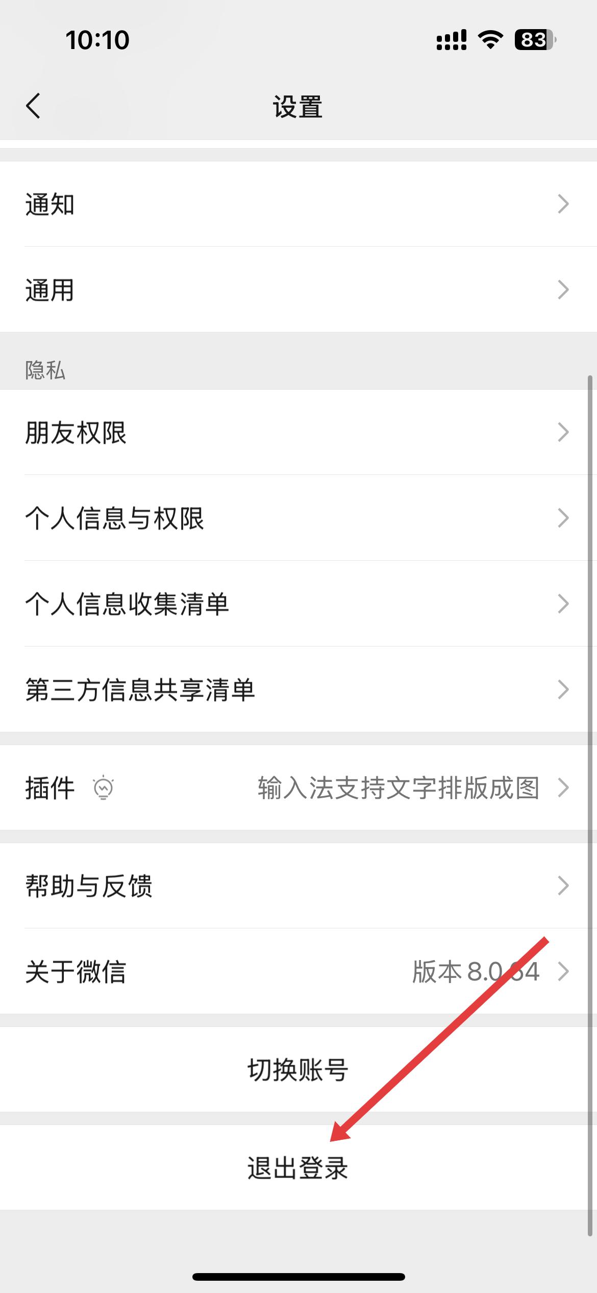 4、滑動(dòng)到設(shè)置界面下方,會(huì)看到切換賬號(hào)和退出登錄選項(xiàng),點(diǎn)擊退出登錄,就能退出當(dāng)前微信賬號(hào)的登錄狀態(tài)。