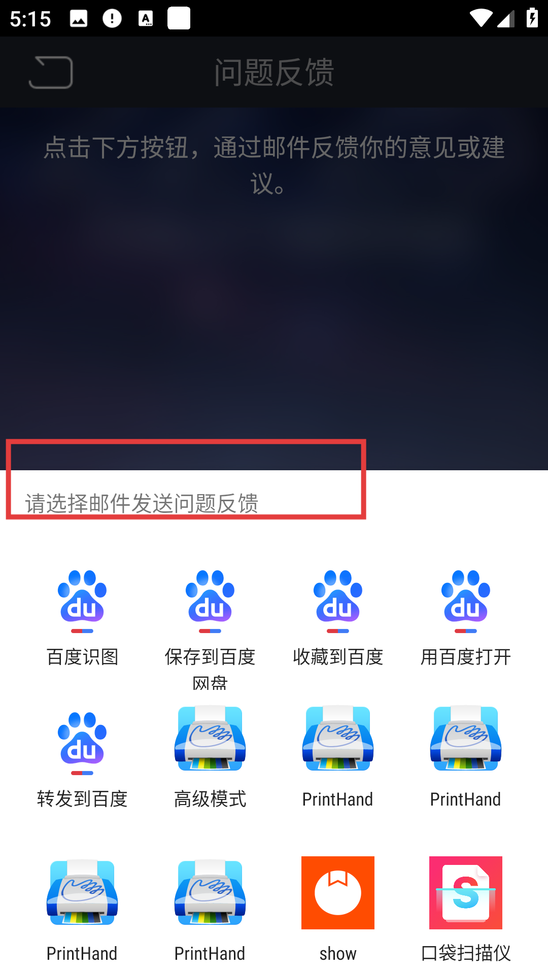 3、點擊郵件反饋后會彈出選擇郵件發(fā)送的界面,在輸入框填寫問題描述,接著從下方應(yīng)用列表選常用郵件應(yīng)用,完成后提交就能把問題反饋給軟件官方。