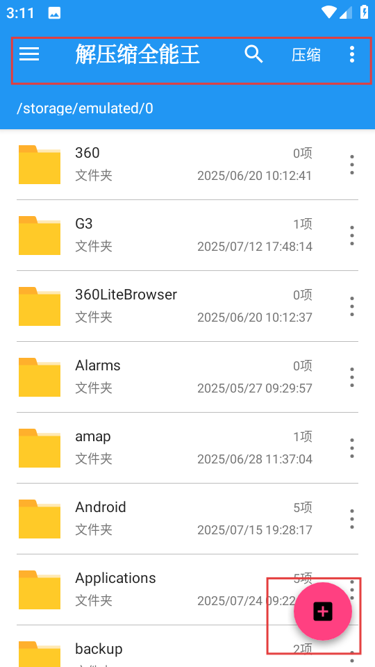 1、主界面頂部顯示軟件名稱,設(shè)有搜索和壓縮功能按鈕,界面展示手機存儲中的文件夾列表,點擊右下角加號按鈕可彈出功能菜單,方便進行新建文件夾、壓縮等操作。