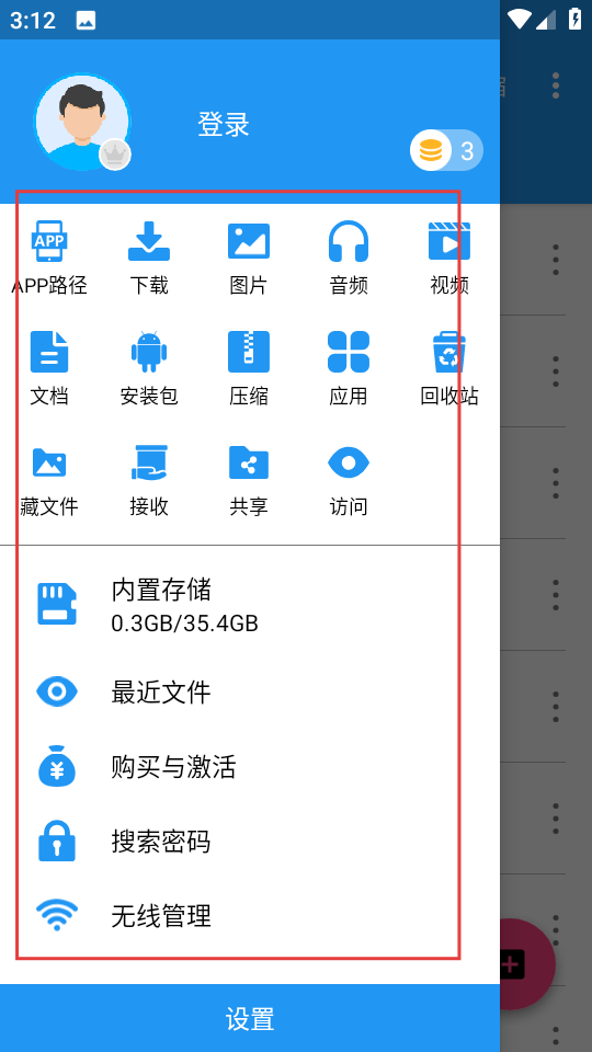 2、點擊主界面左上角的菜單按鈕會彈出功能側(cè)邊欄,側(cè)邊欄有APP路徑、下載、圖片、音頻等多種分類選項,方便快速定位不同類型文件,可根據(jù)需求進行選擇操作。