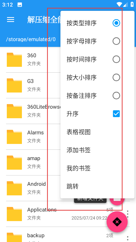 3、在功能菜單中點擊排序相關(guān)選項,會彈出排序設(shè)置窗口,這里提供按類型、字母、時間、大小、備注等多種排序方式,還有升序選項和表格視圖切換功能。