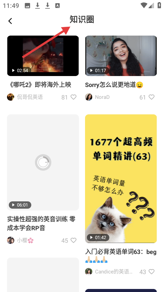 3、知識圈頁面呈現(xiàn)各類英語知識視頻,如哪吒2即將海外上映、Sorry怎么說更地道等,涵蓋文化詞匯等知識。