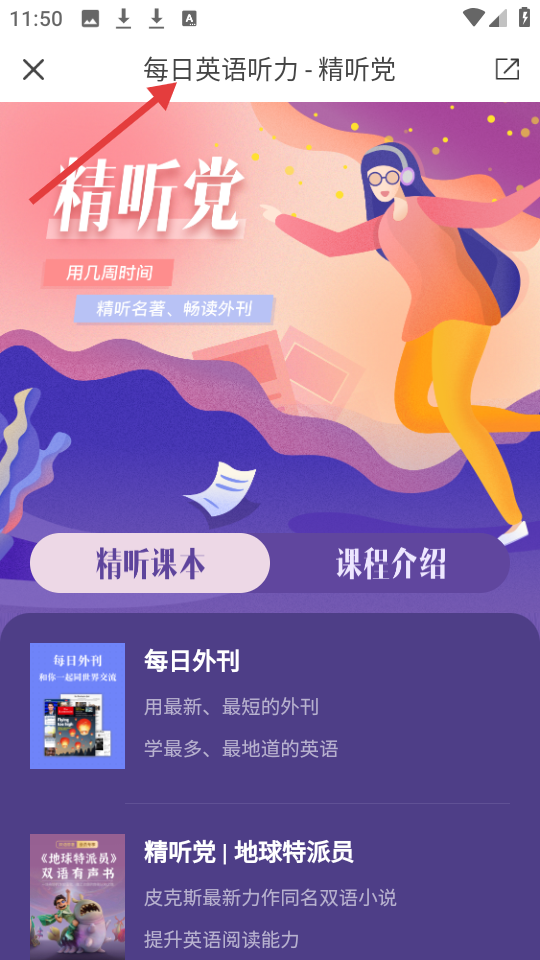 4、每日英語聽力的精聽黨界面,倡導(dǎo)花幾周精聽名著、暢讀外刊,設(shè)精聽課本與課程介紹板塊推薦每日外刊等學(xué)習(xí)內(nèi)容。