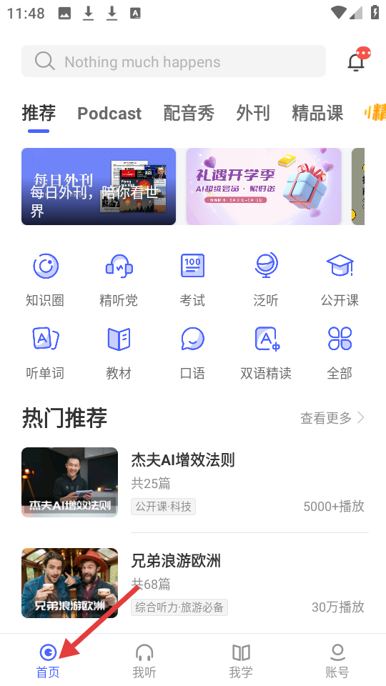1、首頁設(shè)有推薦配音秀等板塊,展示每日外刊和開學(xué)季活動,還有知識圈精聽黨等功能入口及熱門推薦。
