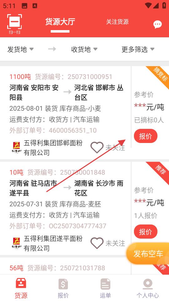 1、進(jìn)入貨源大廳,瀏覽貨源列表,找到心儀貨源,查看貨物信息、運(yùn)輸要求等內(nèi)容,確認(rèn)意向后點(diǎn)擊貨源右側(cè)報(bào)價(jià)按鈕,進(jìn)入報(bào)價(jià)流程。