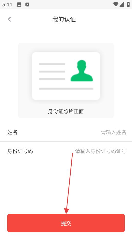 2、若需進(jìn)行身份認(rèn)證,進(jìn)入我的認(rèn)證頁面,上傳身份證照片正面,填寫姓名、身份證號(hào)碼,信息核對(duì)無誤后點(diǎn)擊提交,完成認(rèn)證操作。