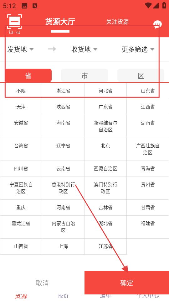 3、在貨源大廳使用篩選功能,選擇發(fā)貨地、收貨地的省、市、區(qū),選定后點(diǎn)擊確定,系統(tǒng)將按篩選條件展示匹配貨源,方便精準(zhǔn)查找。