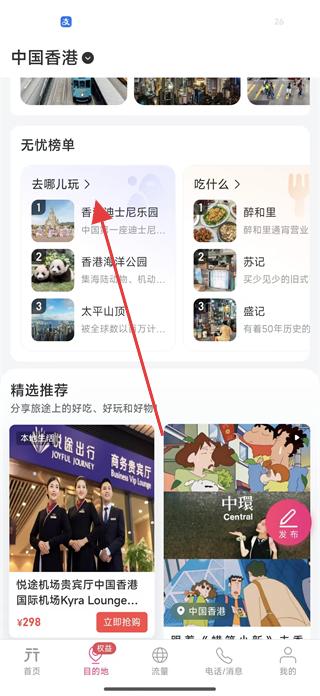 1、點擊底部導航欄中的目的地選項,進入目的地頁面后,找到無憂榜單板塊,點擊去哪兒玩選項。