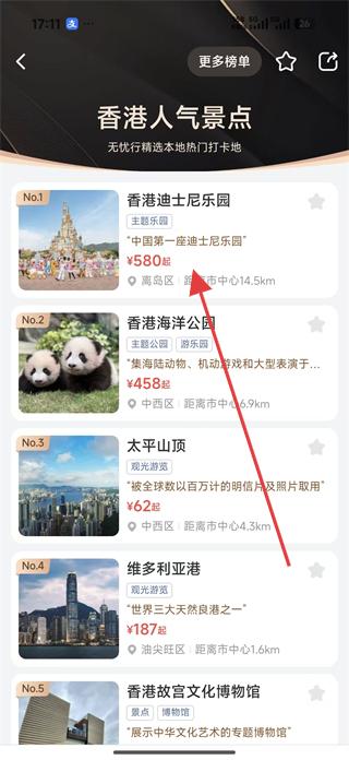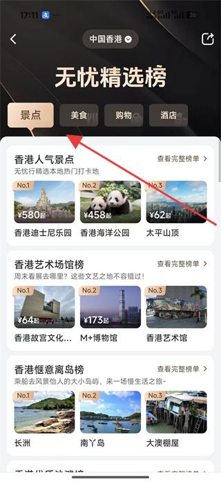 3、若想了解香港其他人氣景點,可返回無憂精選榜頁面,點擊香港人氣景點后的查看完整榜單選項,瀏覽更多景點排名。