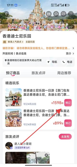 4、在香港迪士尼樂園詳情頁面,還可查看預訂商品、旅友點評等信息,若有出游需求,可選擇合適的門票套餐點擊預訂。
