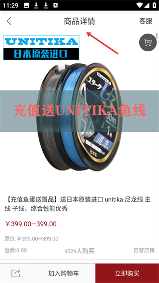 3、商品詳情頁展示日本進口UNITIKA魚線,充值送贈品,價格399元,可加入購物車或立即購買,自營店鋪包郵。