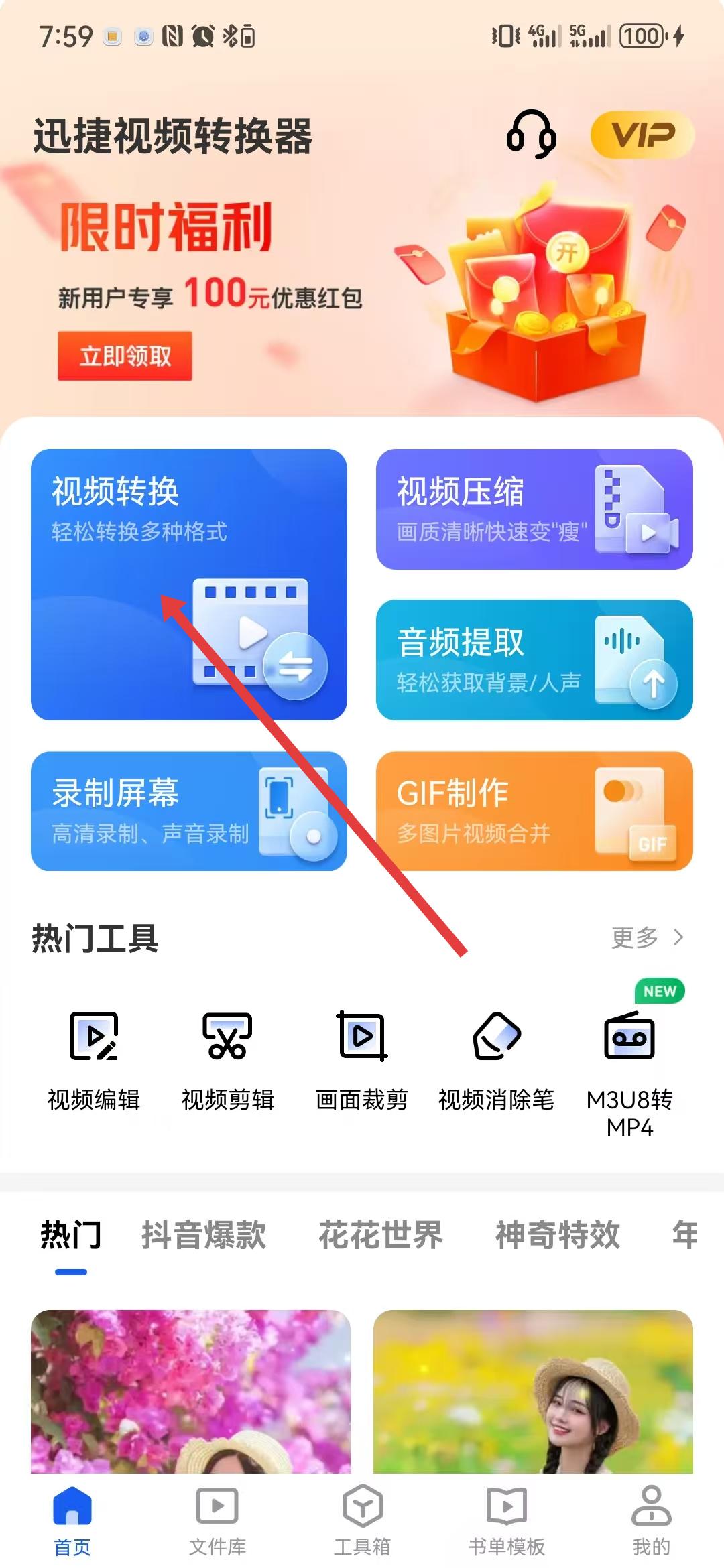 1、打開(kāi)迅捷視頻轉(zhuǎn)換器應(yīng)用,在首頁(yè)可以看到視頻轉(zhuǎn)換、視頻壓縮等多種功能選項(xiàng),點(diǎn)擊視頻轉(zhuǎn)換選項(xiàng)進(jìn)入視頻格式轉(zhuǎn)換的操作界面。