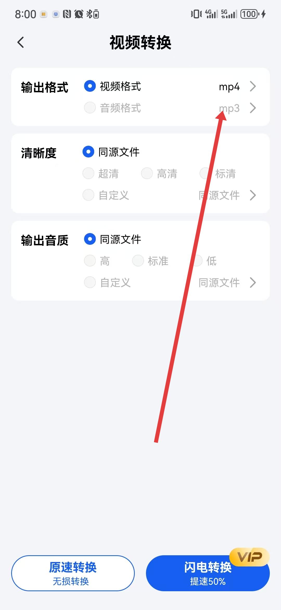 2、進(jìn)入視頻轉(zhuǎn)換界面后,在輸出格式選項(xiàng)中選擇視頻格式,并將具體格式設(shè)置為mp4,同時(shí)還可以根據(jù)需求選擇清晰度和輸出音質(zhì)。
