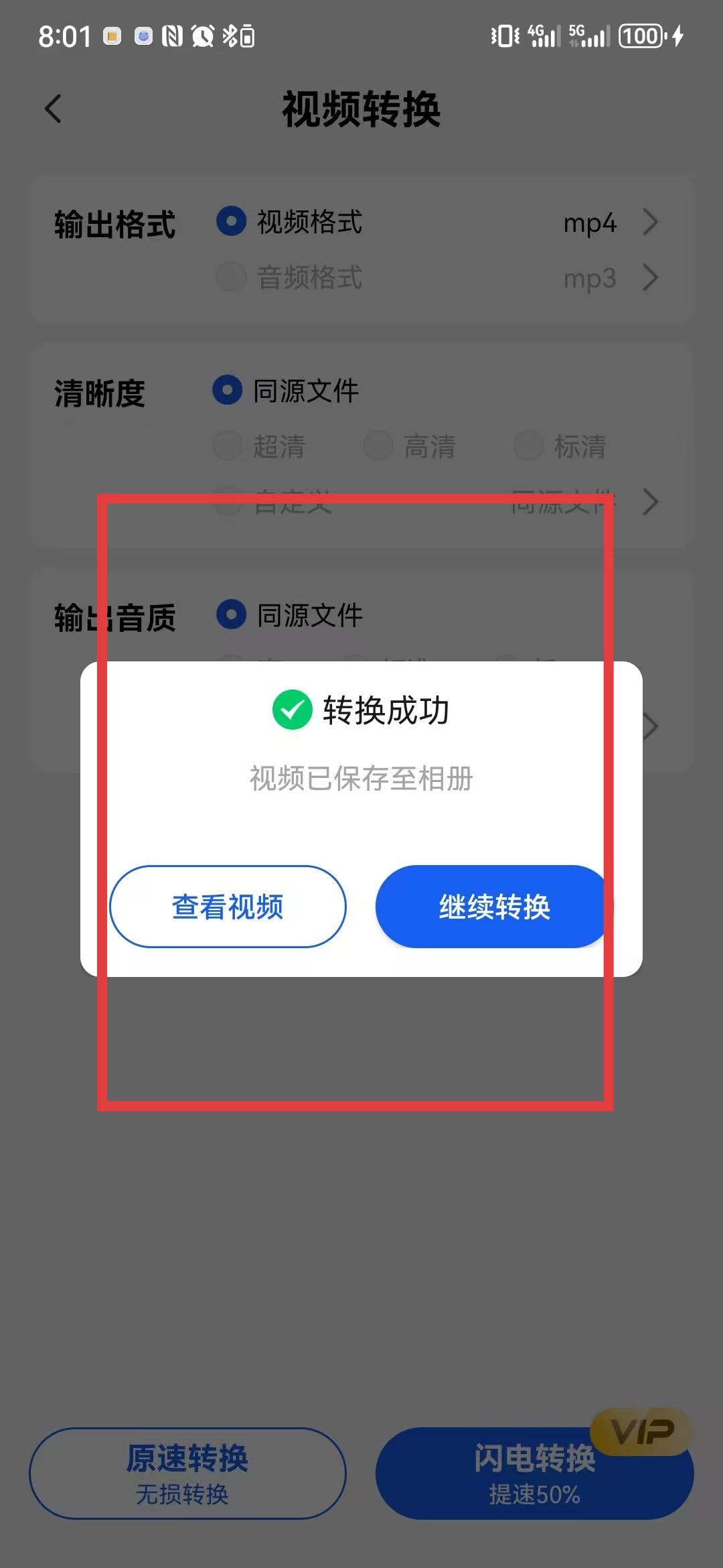 3、完成格式等設(shè)置后點(diǎn)擊原速轉(zhuǎn)換按鈕,等待轉(zhuǎn)換完成出現(xiàn)轉(zhuǎn)換成功提示框,點(diǎn)擊查看視頻可查看已轉(zhuǎn)換為MP4格式的視頻,點(diǎn)擊繼續(xù)轉(zhuǎn)換則可以進(jìn)行下一個(gè)操作。