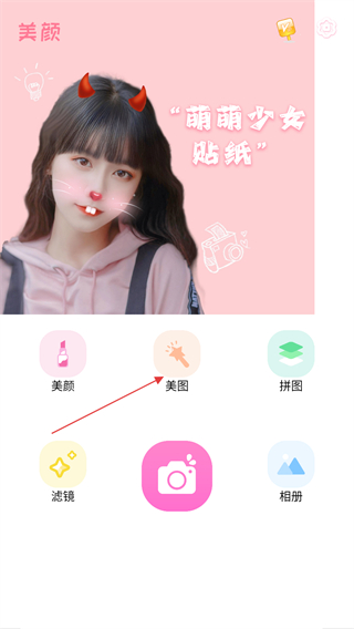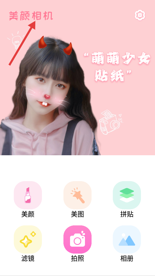 1、美顏相機(jī)首頁(yè)粉色背景清新可愛,展示萌萌少女貼紙,設(shè)有美顏、拍照、拼圖等豐富功能,開啟趣味拍攝。