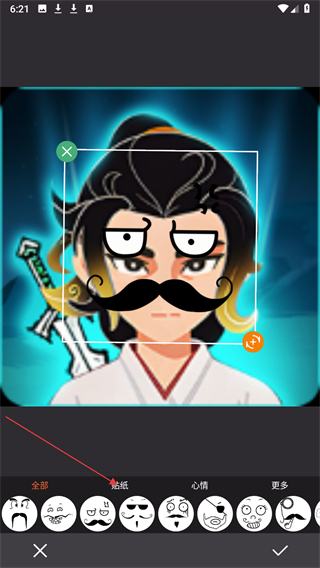 3、擁有多種類型的貼紙如全部、惡搞、心情等分類,用戶可將貼紙?zhí)砑拥綀D片上,增加趣味性和個(gè)性化元素。