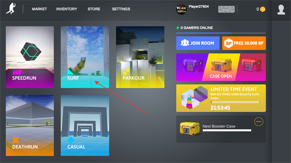1、在游戲主界面點(diǎn)擊Surf等模式選項(xiàng),進(jìn)入不同的游戲場(chǎng)景,不同模式有不同的挑戰(zhàn)規(guī)則,比如Surf模式更注重跳躍的技巧和連貫性。
