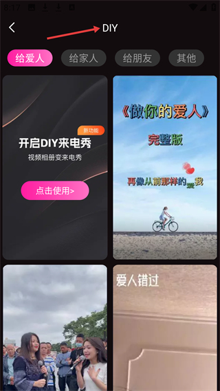 2、DIY板塊可制作給愛人、家人等不同對(duì)象的來電秀,還有做你的愛人等視頻資源,支持用戶個(gè)性化創(chuàng)作專屬來電內(nèi)容。
