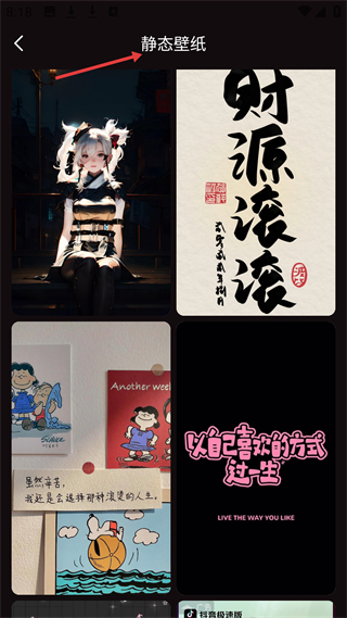 3、靜態(tài)壁紙板塊有動(dòng)漫風(fēng)格、書法文字、勵(lì)志語錄等各類壁紙,視覺選擇多元,助力用戶美化手機(jī)界面。