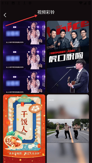 4、視頻彩鈴板塊有中國(guó)好聲音相關(guān)視頻、干飯人主題等多樣視頻彩鈴,風(fēng)格豐富,滿足用戶個(gè)性化彩鈴設(shè)置與展示需求。