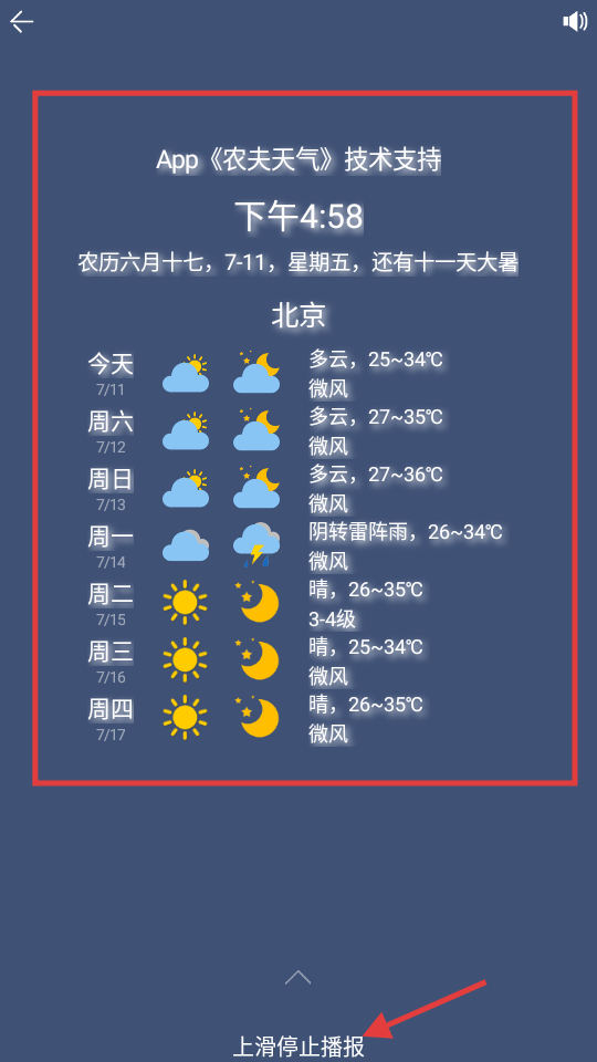 3、進入軟件語音播報界面,上方紅框展示技術(shù)支持、時間、農(nóng)歷日期、北京多日天氣等信息,同步語音講解氣象內(nèi)容,底部上滑停止播報按鈕,可讓用戶按需終止語音。