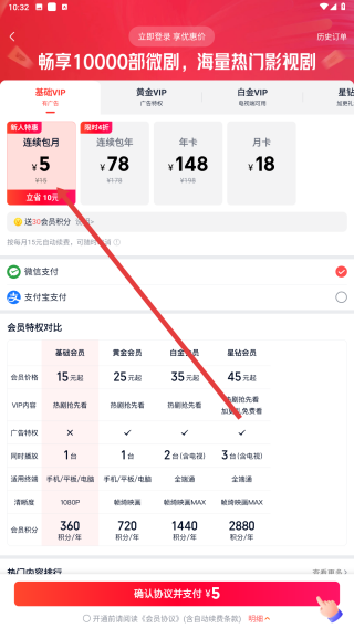 4、登錄后,可選擇開(kāi)通會(huì)員,查看不同會(huì)員類(lèi)型及價(jià)格,如連續(xù)包月、連續(xù)包年等,確認(rèn)后點(diǎn)擊支付,開(kāi)通會(huì)員享受更多權(quán)益。